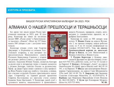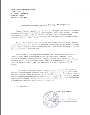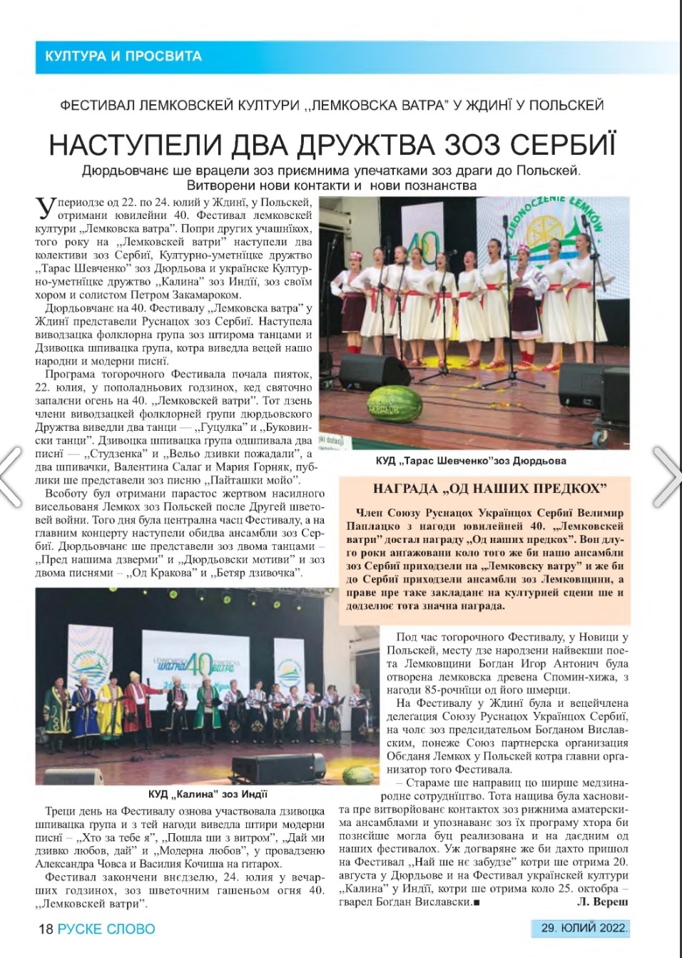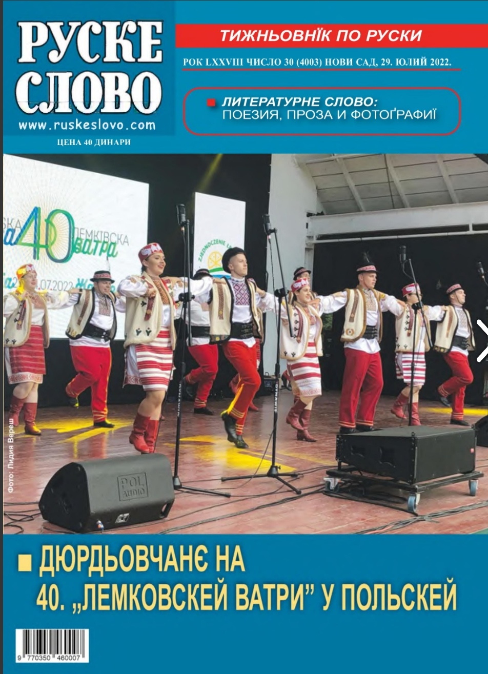 - Он_ лајн програм КУД "Тарас Шевченко" из Ђурђева, са поздравом Савеза, приказан је на фестивалу "Дзвони Лемкившчини", који је одржан у месту Монастириск у Украјини, дана 1. августа 2020. године.