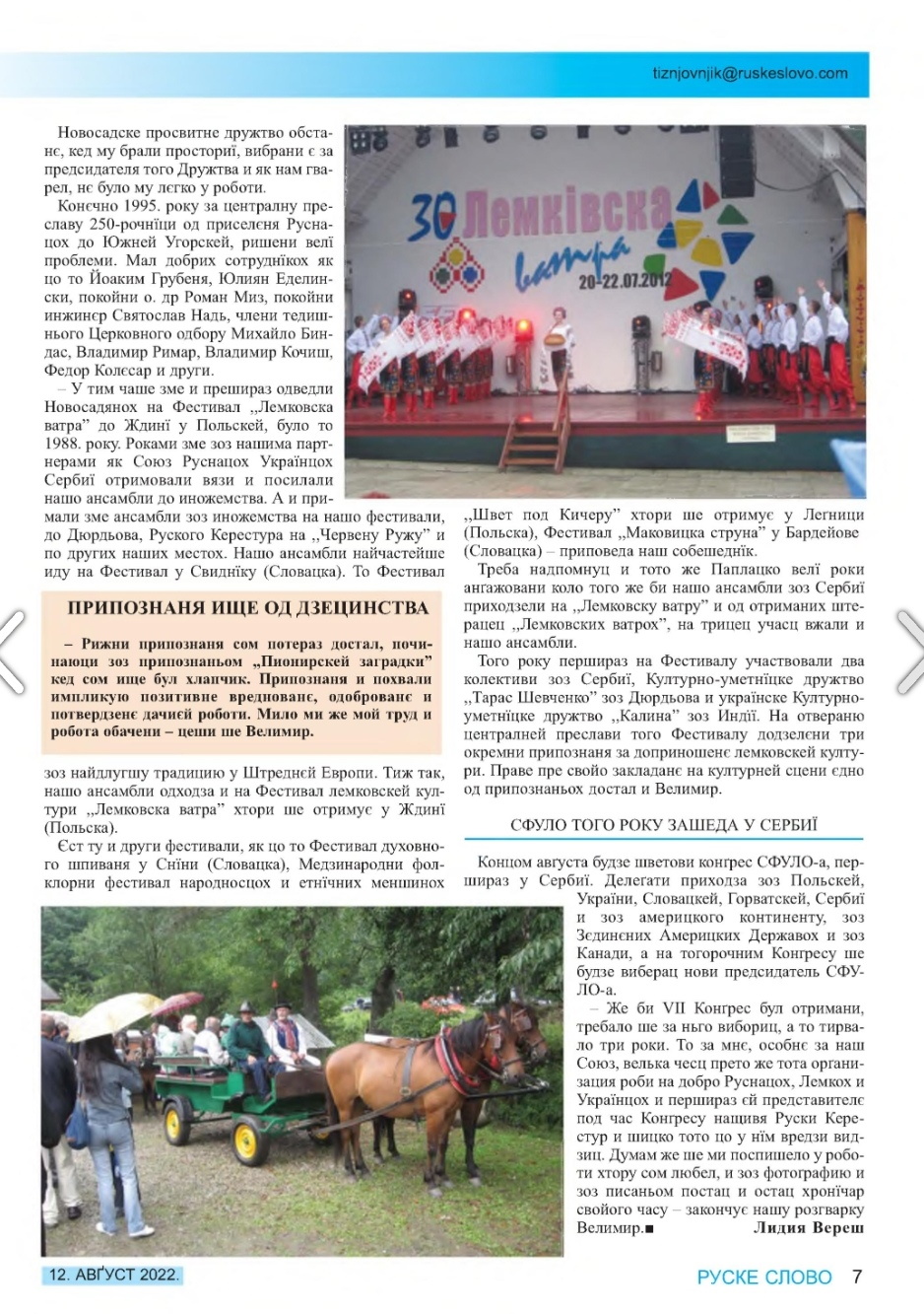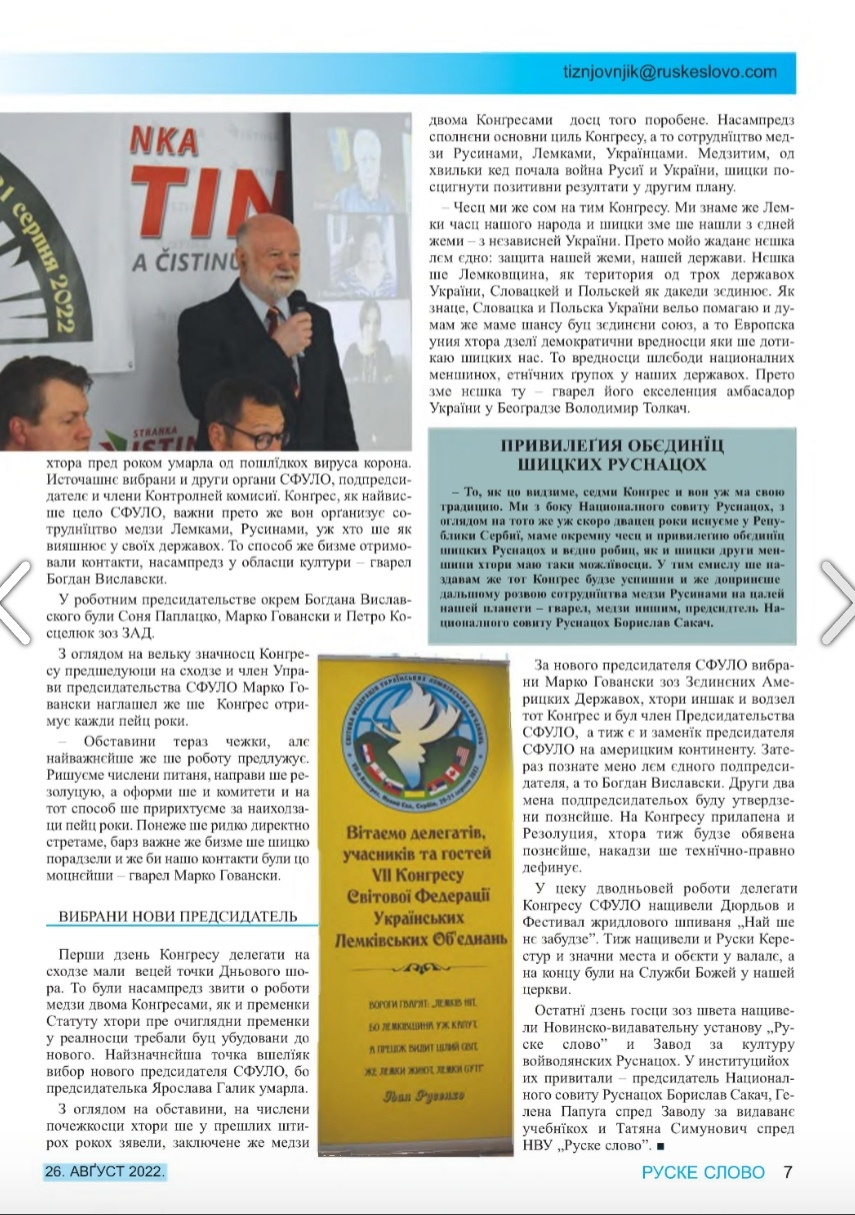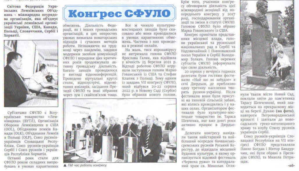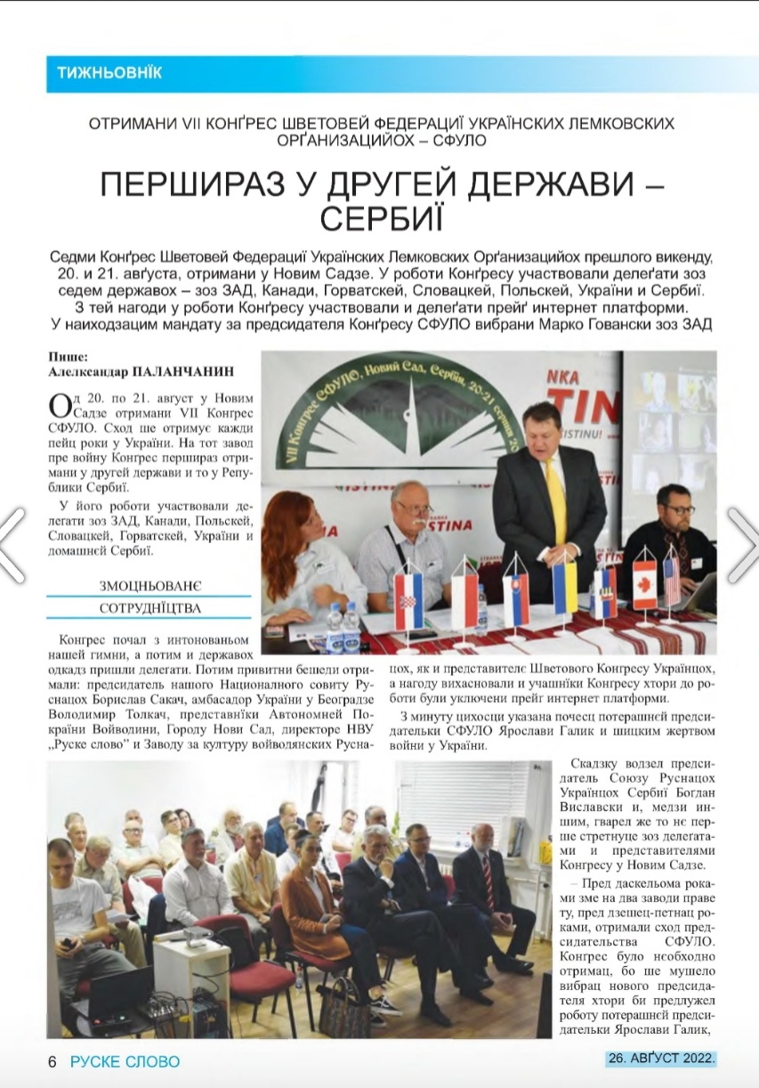 - Одржано је он-лајн заседање СФУЛО ( Светска федерација украјинских лемковских удружења ) дана 25. јула 2020. године . Том приликом је информисано о он лајн-поздравима и програмима за приказивање на фестивалима које организује СФУЛО.