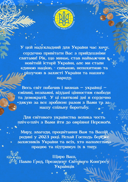 Від імені Світового Конґресу Українців та своєї родини, дружини Адріянни і дітей – Романа, Данила, Лариси і Олени, бажаю Вам миру, здоров’я, злагоди, радісного Різдва та щасливого Нового року.